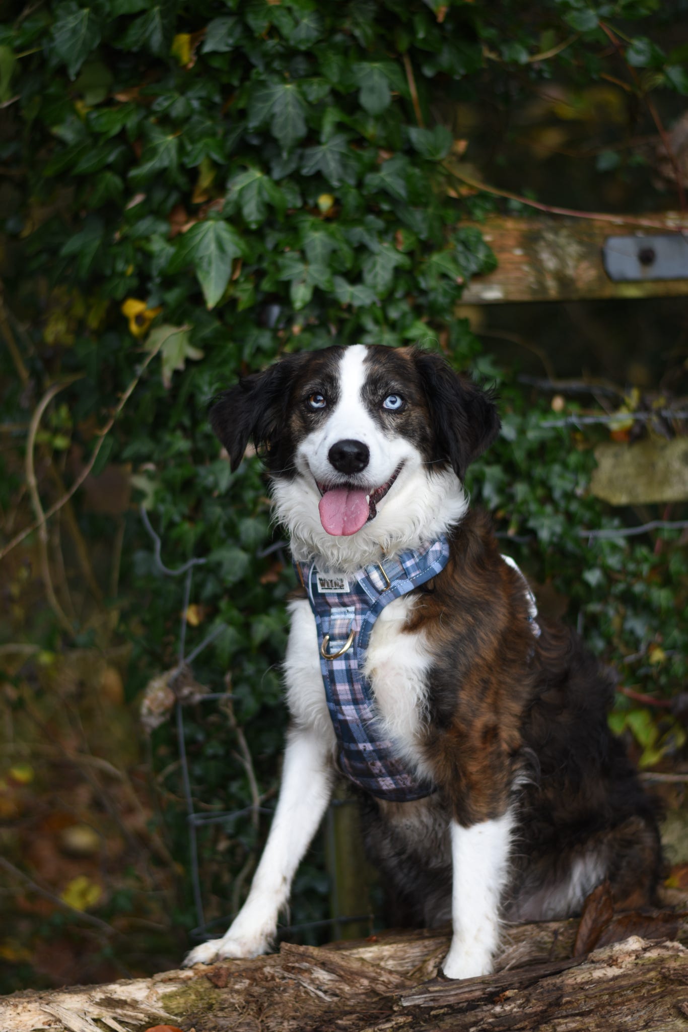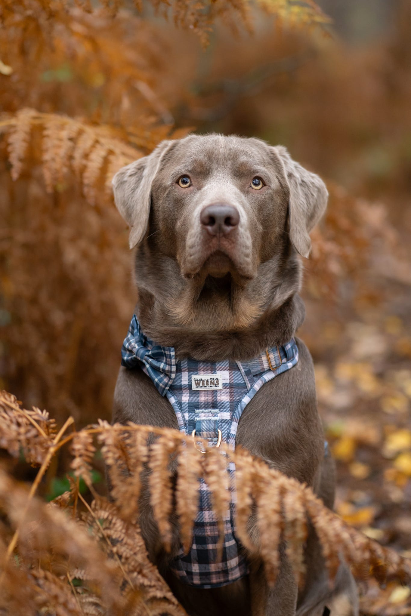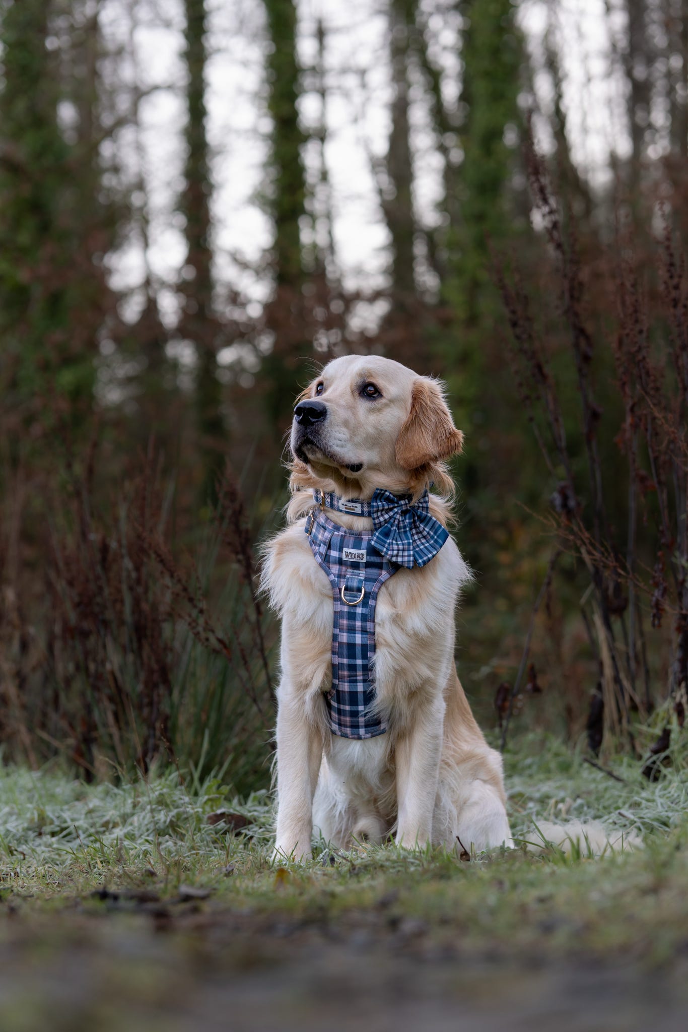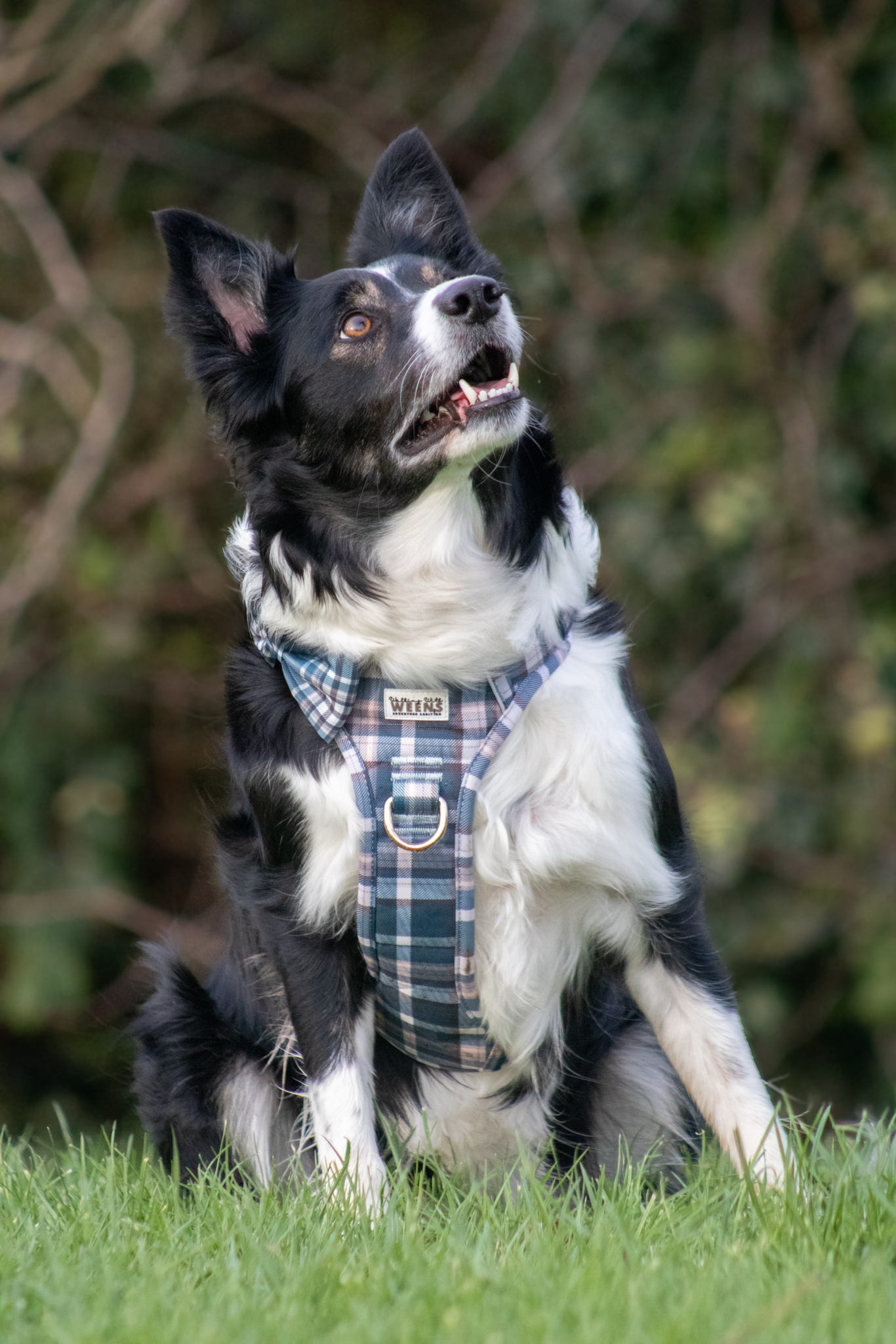• Front: The larger panel with the logo sits across your dog’s chest.
